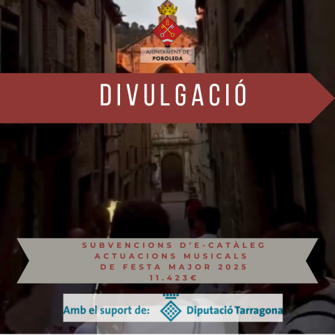 La Diputació de Tarragona, mitjançant l'e-Catàleg ha concedit a l'Ajuntament de Poboleda les següents subvencions: -Xaranga Suquet Calero 1000€ -Zamba Show 2923€ -Companyia pa sucat amb oli 4000€ -Companyia pa sucat amb oli 3500€